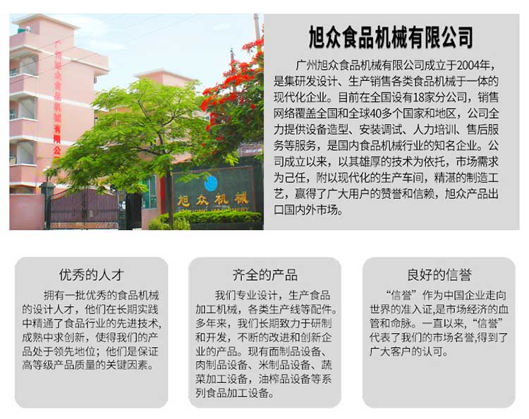 广州旭众食品机械有限公司是一家集科研开发,生产设计,营销服务为一体的现代化生产企业。现代化生产车间,精湛制造技术,所产机械历经市场重重考验,不断赢得海内外客户的赞誉。