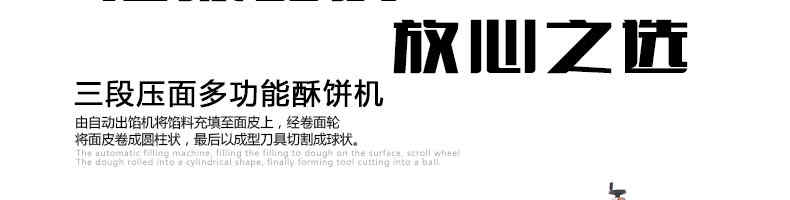 SZ-09C三段压面苏式月饼机,生产速度、制品大小、重量、皮馅比例可随时调整、变更。适用于苏式月饼、绿豆饼、老婆饼、葱油饼、鲜花饼、肉松饼、金华酥饼等。适用于大、中型糕饼生产厂家,免费提供工艺技术。