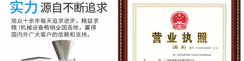 广州旭众食品机械有限公司是一家集科研开发,生产设计,营销服务为一体的现代化生产企业。现代化生产车间,精湛制造技术,所产机械历经市场重重考验,不断赢得海内外客户的赞誉。
